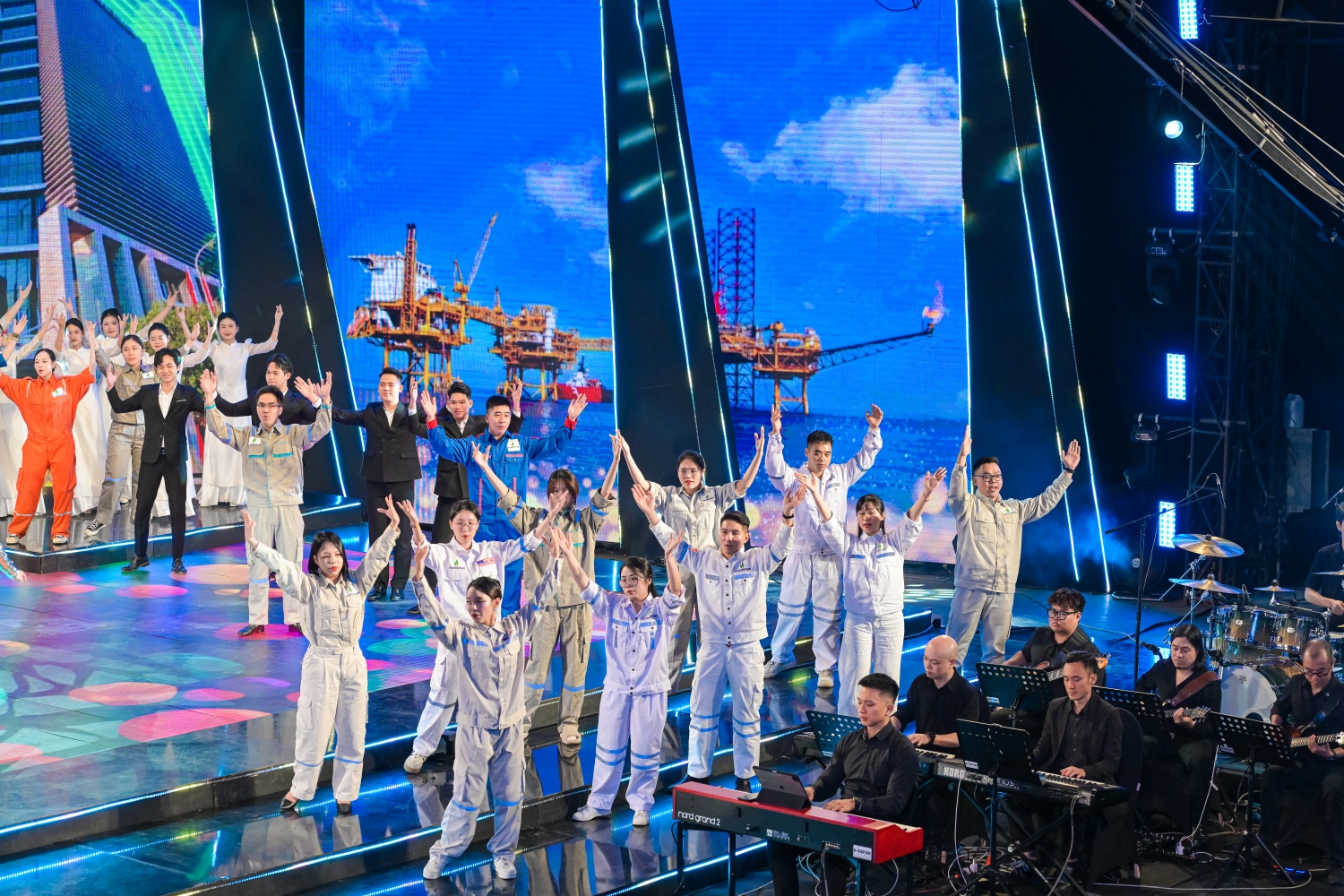 Mở đầu chương trình bằng ca khúc “Ca ngợi Tổ quốc” của nhạc sĩ Hồ Bắc, một sáng tác đã 65 năm tuổi không chỉ là sự lựa chọn mang tính biểu tượng mà còn hàm chứa thông điệp rõ ràng của Ban tổ chức về câu chuyện “giữ lửa” của người lao động Petrovietnam không tách khỏi mạch nguồn lịch sử 80 năm dựng xây và bảo vệ Tổ quốc.