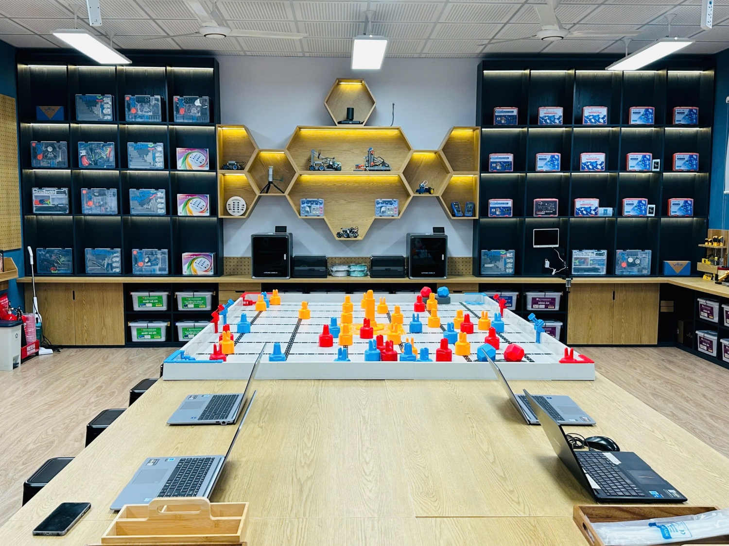 Điểm đặc biệt của các phòng thực hành này là các trang thiết bị được ứng dụng trí tuệ nhân tạo (AI), giúp học sinh dễ dàng tiếp cận và sáng tạo các sản phẩm công nghệ AI. Bên cạnh đó, các em học sinh còn được thực hành với các thiết bị hỗ trợ IoT (Internet of Things) với công nghệ hiện đại để tạo ra các mô hình, sản phẩm “thông minh” có thể ứng dụng vào thực tiễn. Đồng thời, phòng STEM cũng trang bị hệ thống Robotics, các vật dụng lắp ghép Robot, cánh tay Robot, module động cơ, máy in 3D… giúp học sinh thỏa sức tư duy, sáng tạo và thực hành.