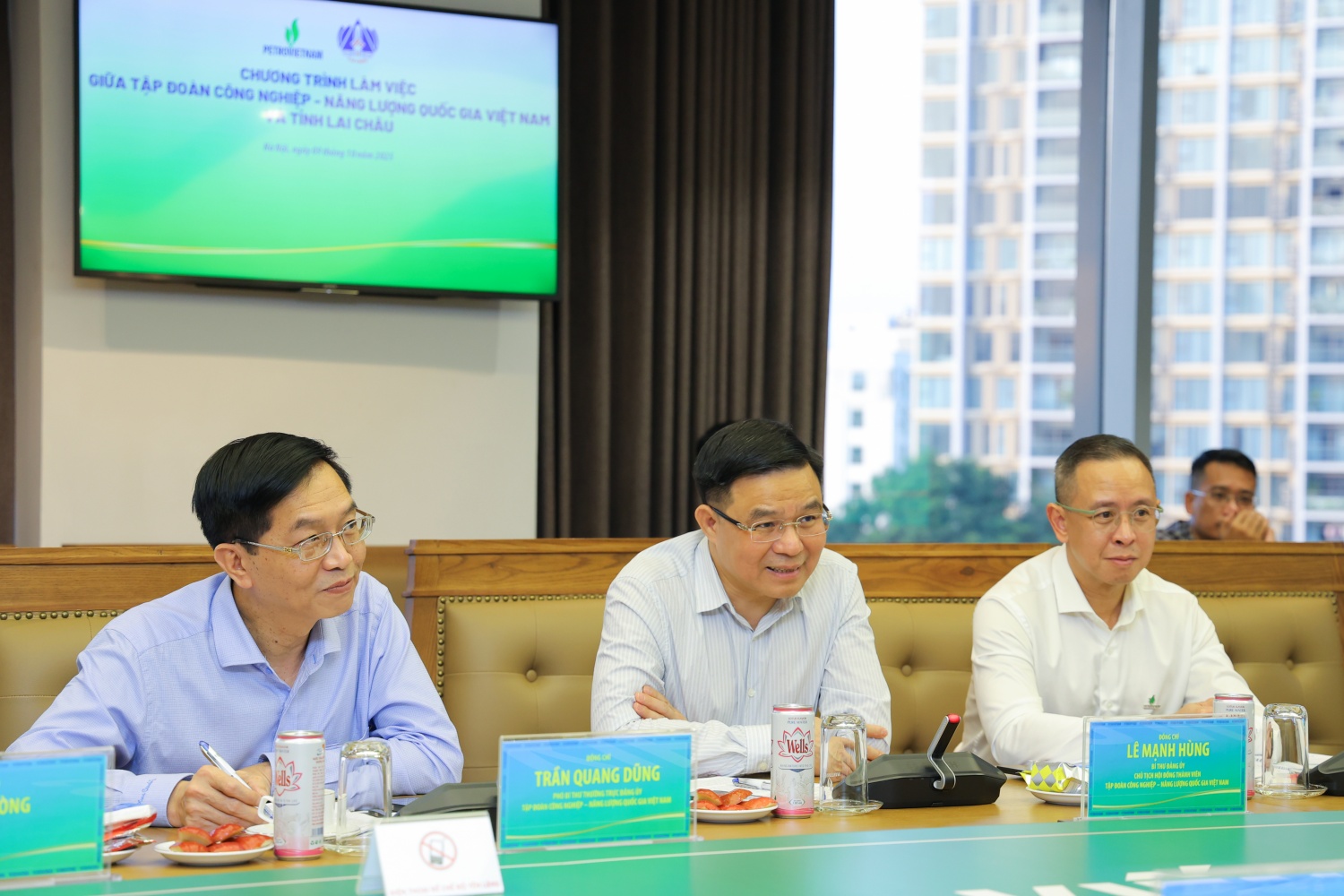 Đồng chí cho biết, tuy là một tỉnh còn nhiều khó khăn, Lai Châu có nguồn tài nguyên thiên nhiên phong phú và đa dạng, là lợi thế quan trọng để phát triển kinh tế xanh, năng lượng tái tạo và du lịch sinh thái. Địa hình chủ yếu là núi cao, chia cắt mạnh, có nhiều sông suối, hồ chứa với trữ lượng nước lớn, thuận lợi cho phát triển thủy điện, điện tích năng, năng lượng mặt trời và điện gió. Chính vì vậy, thông qua buổi làm việc, lãnh đạo tỉnh Lai Châu mong muốn Petrovietnam tiếp tục quan tâm, nghiên cứu đầu tư các dự án năng lượng trên địa bàn tỉnh.